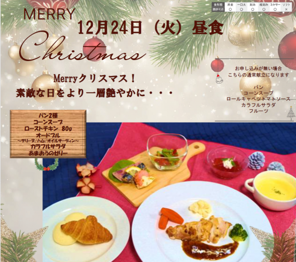 12月24日ご希望の入居者様へ昼食にクリスマスメニューをお出しさせていただきます( *´艸`)