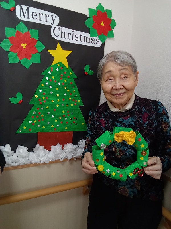 クリスマスの壁飾りの前で写真を撮りました!