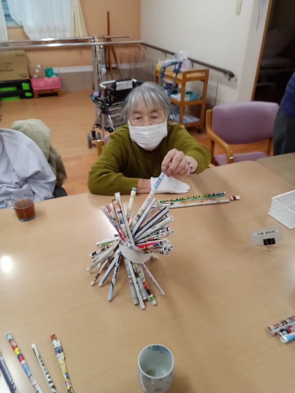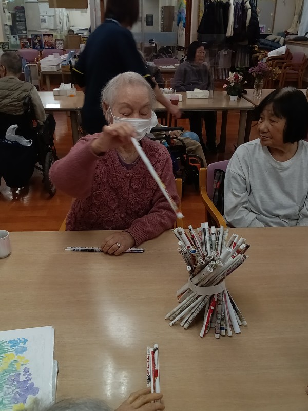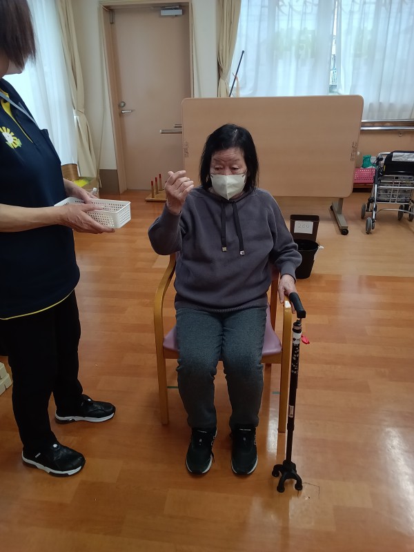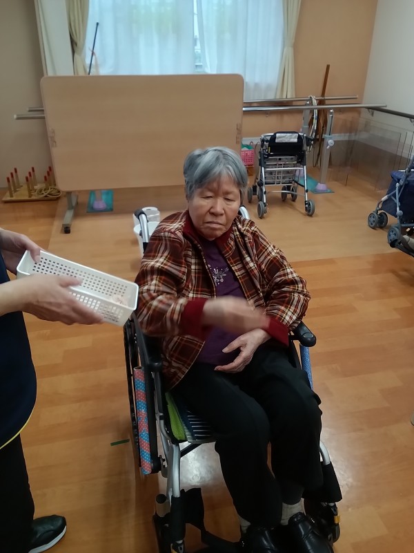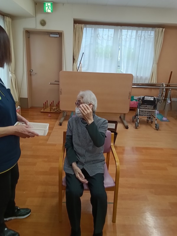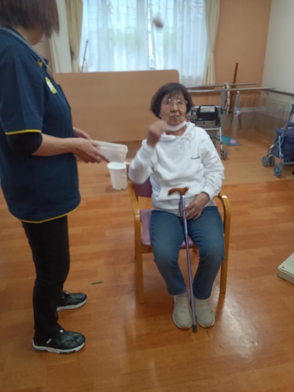 今日のレクは、後ろ向きお手玉です。