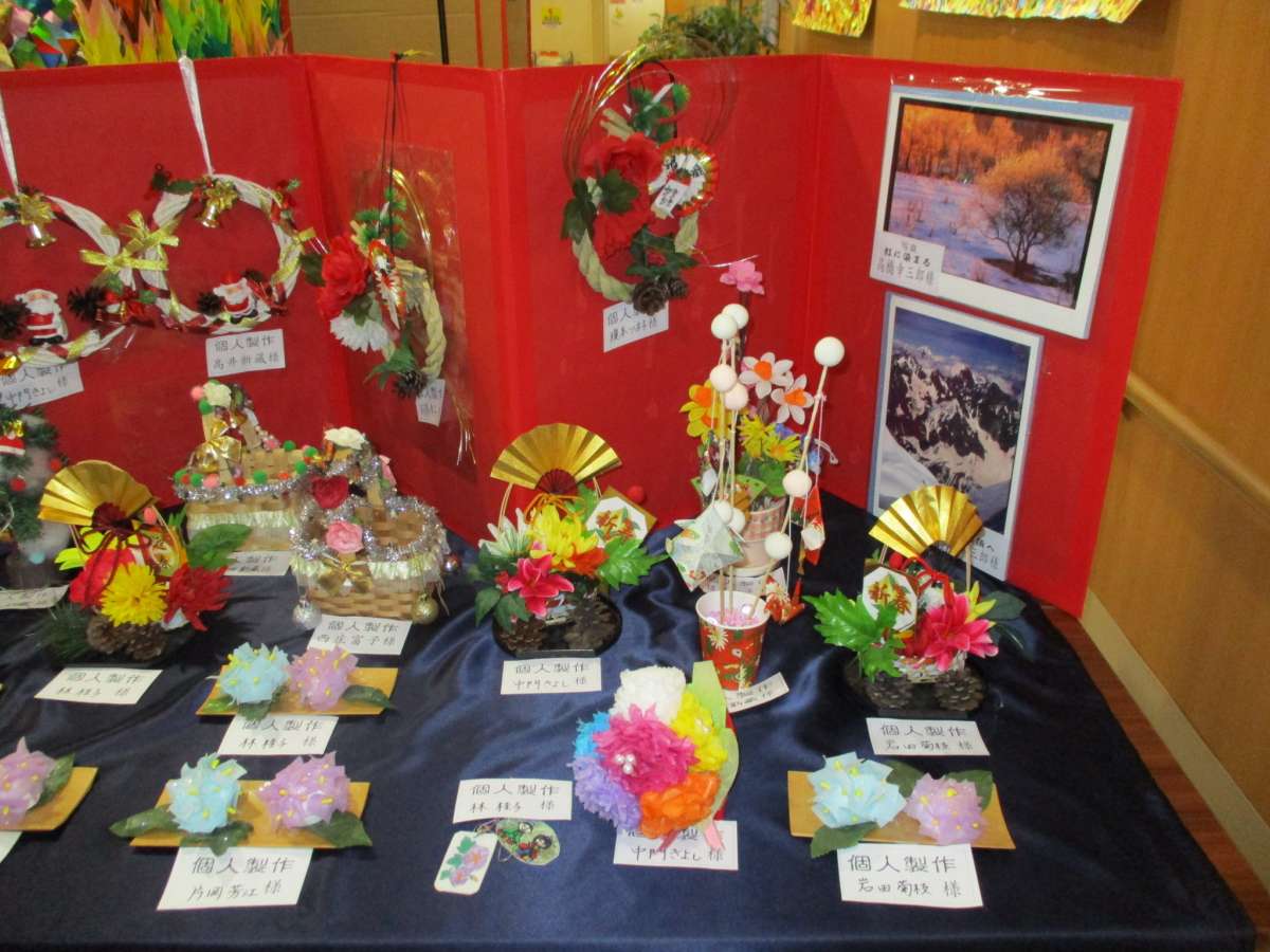 文化祭ではご利用者様の作成した作品展示や、過去に趣味活動で作った挿し子や手芸作品、写真集なども展示