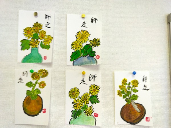半紙に模様を描いて筆を手になじませませたら、主題の寒菊に移ります。