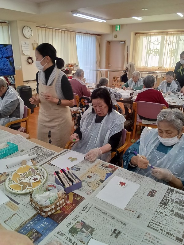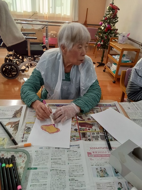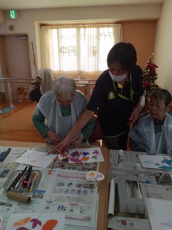 落ち葉にインクペンを塗って、紙に押し付けた作品を皆で作っていきました。