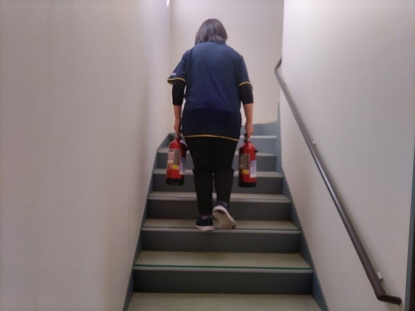 非常ベル作動後、消火器を1Fから2Fへ運びます
