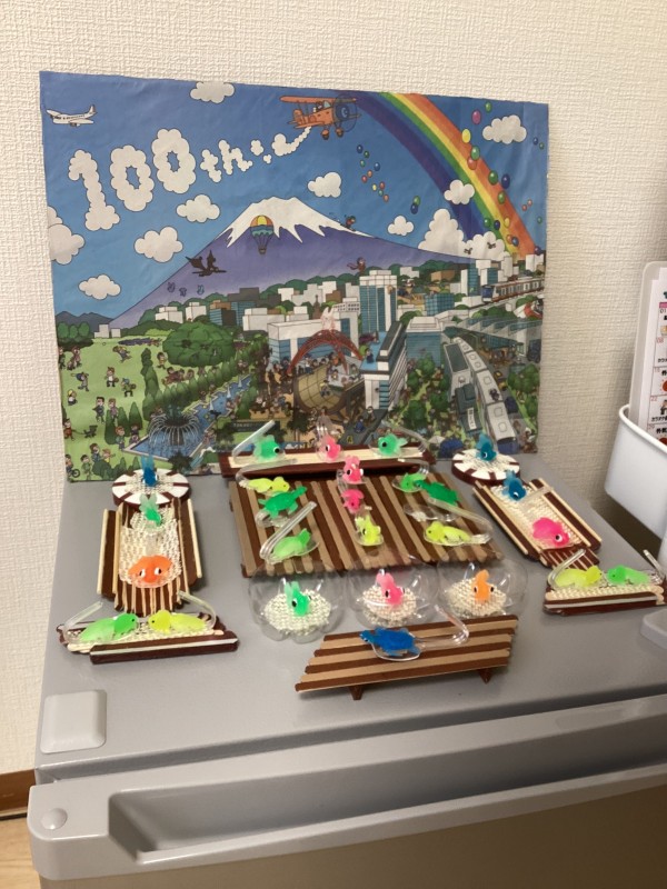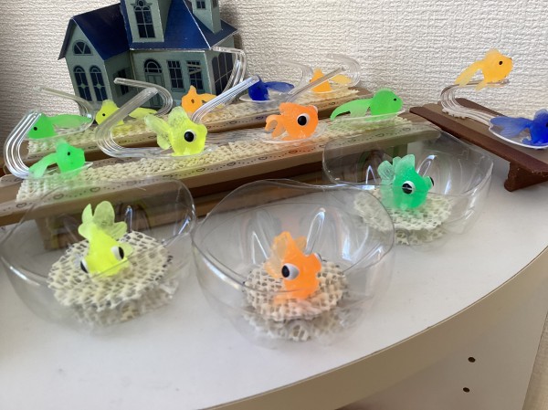 金魚さんたちが載せられているのは、プラスティックのスプーンやあずきバーの棒、ペットボトルの底の部分です。