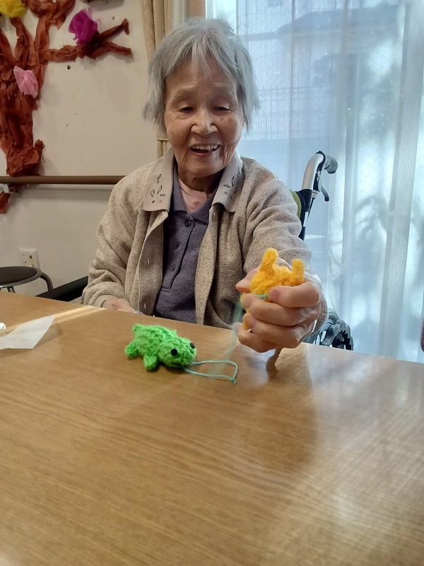 スタッフが手作りした小さな縫いぐるみを入居者様に見てもらった様子です