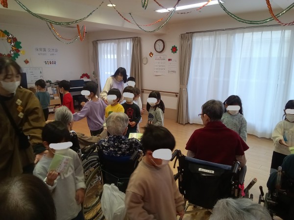 利用者様と園児たちと手をつないだり、プレゼント交換したり、