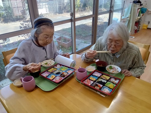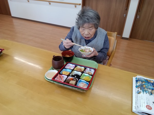 1月1日 お正月・おせち料理を召し上がっているご様子です( ^ω^)・・・ あら~! おせち料理をご馳走してくれるの? 嬉しいわ! と喜ばれていました(*^_^*) 伊達巻や栗きんとんや12種類とちらし寿司のおせち料理をご用意しました。美味しい美味しいと仰られました(*´ω`*) みなさま完食しました。