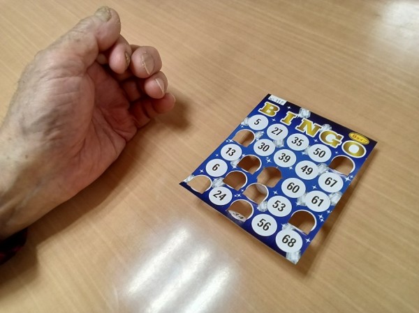 ビンゴは写真のように、機械が読み上げた数字を、ポチポチ穴をあけ1列そろったら、