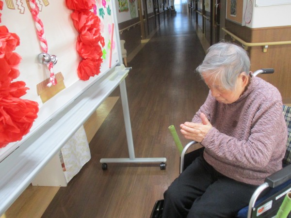 “与野公園神社”をホワイトボードに掲示して各階巡回の初詣をしました。