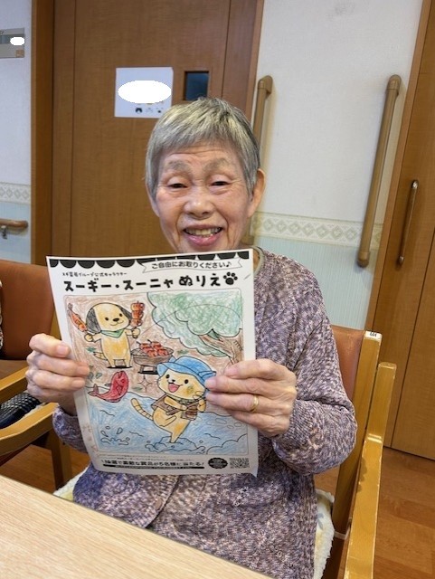 完成したぬり絵を手に、