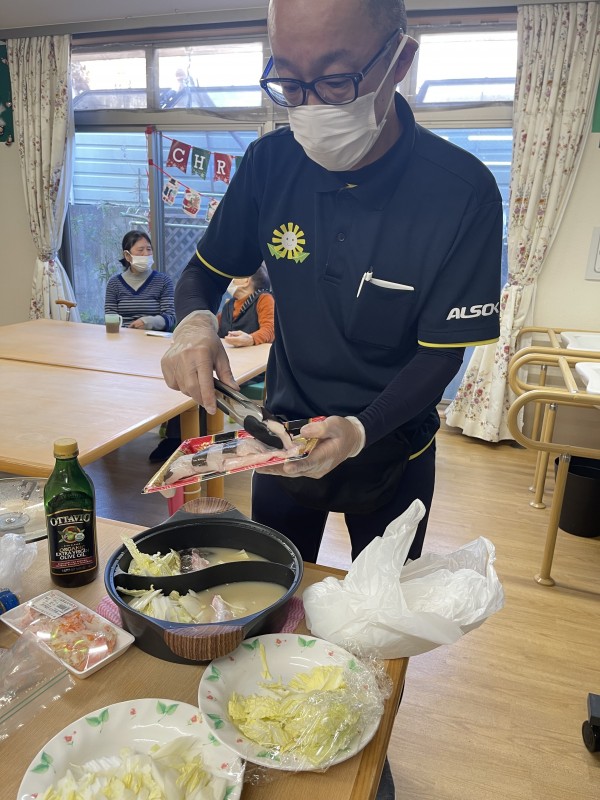 豚肉、鶏肉、白子が豪快に入った鍋は、肉好きの利用者さんたちに大好評!