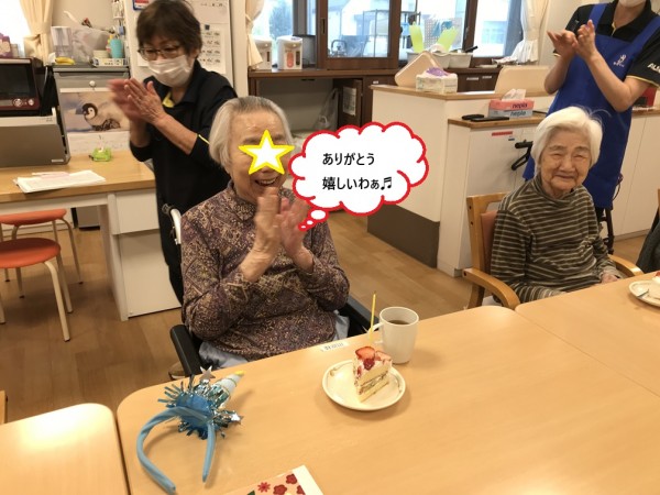3名の皆さんがおお誕生日だったようです。ケーキのろうそく フ―っと吹き消して美味しく頂きました♬