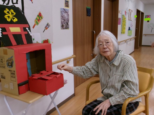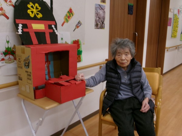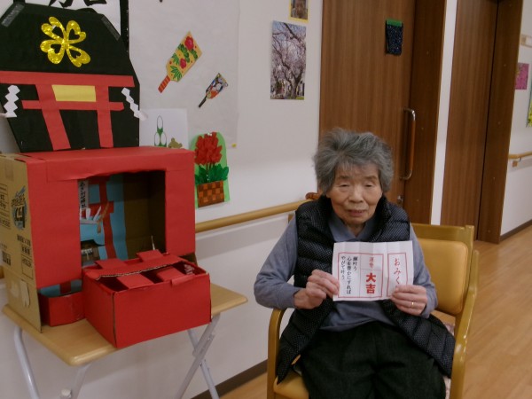 小さな神社を作りお参りしました。健康でいいことがありますように!とみんなでお参りしました!(^^)! おみくじを引かれ「大吉だって? 小吉だわ!」と楽しんでおられました(*^_^*) 楽しまれたひと時でした( ^)o(^ )