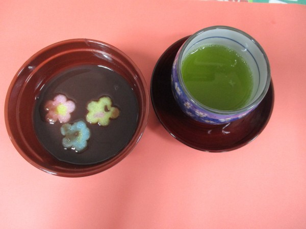 お餅代わりに花柄のお麩を浮かべました。甘くて美味しい、久しぶりと好評でした。
