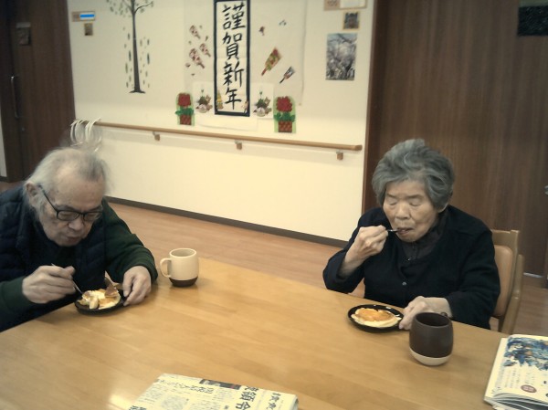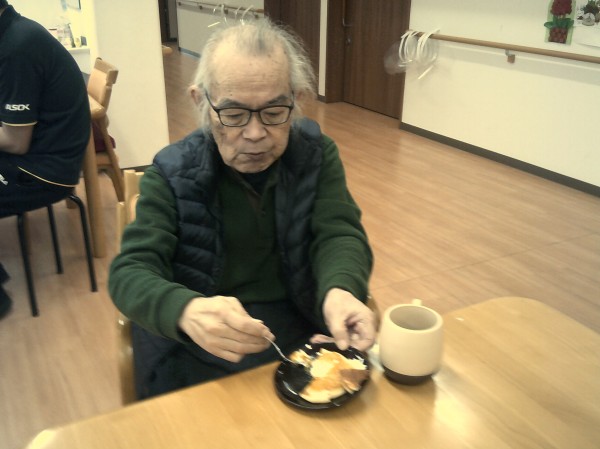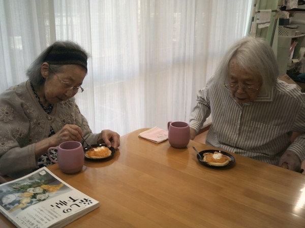 今回は、おやつに職員の手作りホットケーキを召し上がっていただいた時の様子です(^^♪