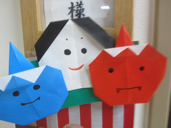 さまざまな色の折り紙で鬼と福を作成しました\(^o^)