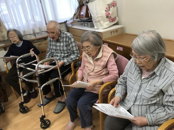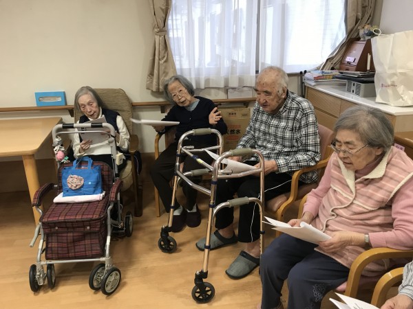 節分の日、鬼退治の後に歌会を行いました♪歌の本をお渡しして、季節の唱歌や童謡をたくさん皆さんで歌いました♪タンバリンも用意してとても盛り上がりましたね♪