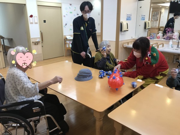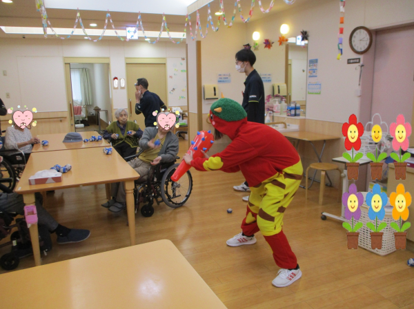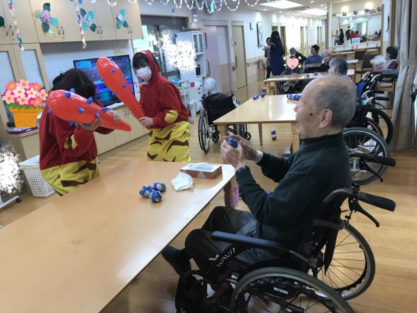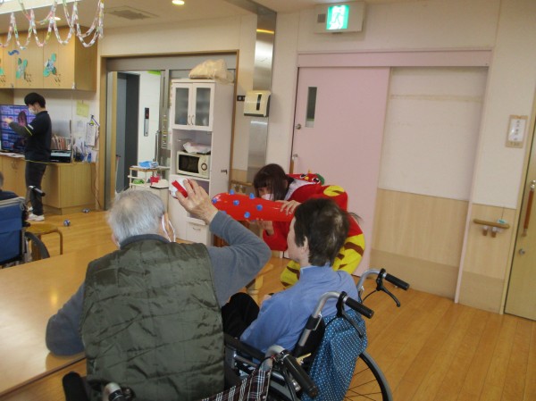 鬼の登場に目を真ん丸にして驚く利用者様もいれば、玉を持って今か今かと待っている利用者様も(笑)