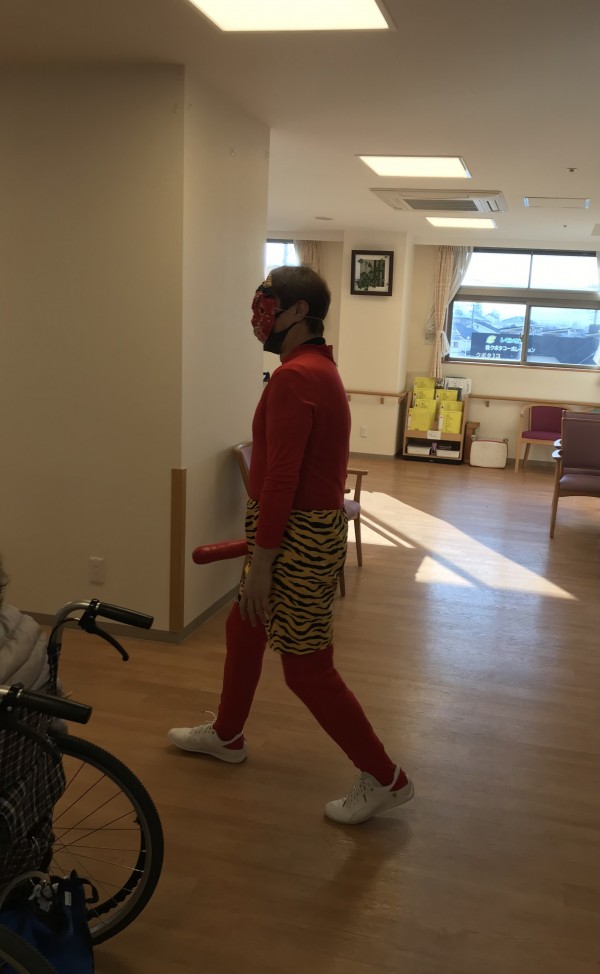 背後から赤鬼が襲いにかかっています!?気配に気づき怯えるご利用者様(>_<)