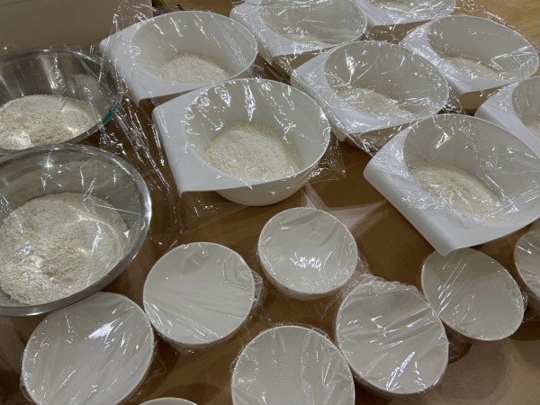 二人一組になってもらい、強力粉・塩に少しずつぬるま湯を入れてこねていきます。手慣れた方が多く「変わろうか?」など声をかけて協力しながら生地を作りました!