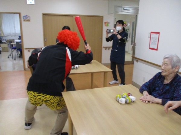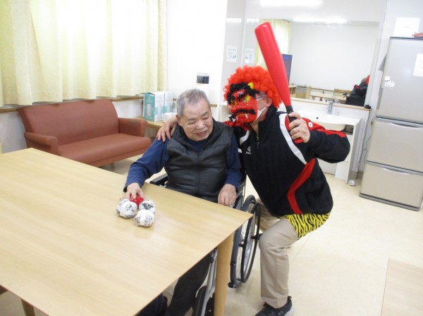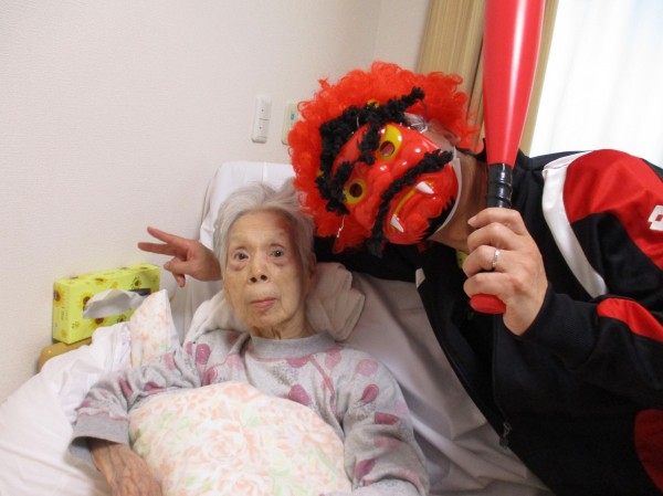 振り向きその球筋の先にいたご利用者様に近づくと、静かながら連投で「鬼は~外!」と鬼めがけて投げ続きていました。