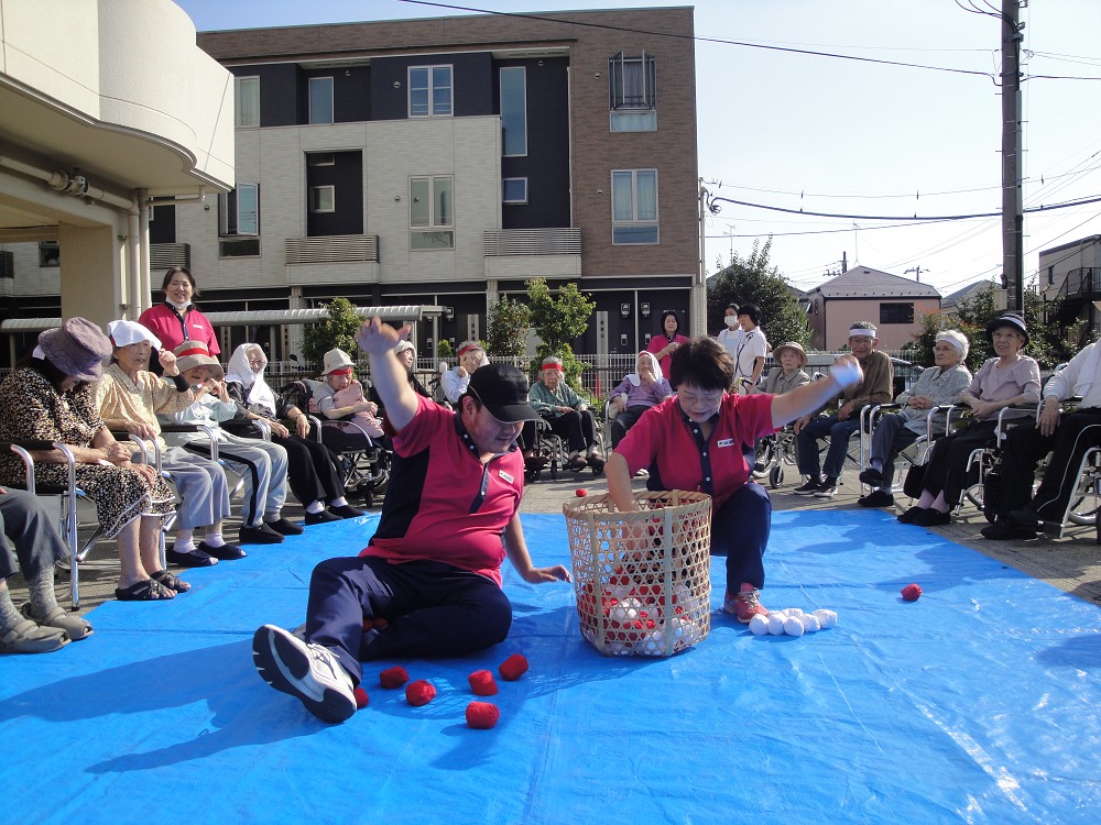 「玉入れ競技」かごの中には沢山玉が入りました。