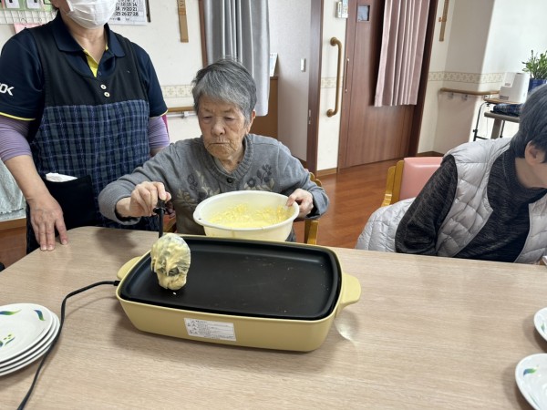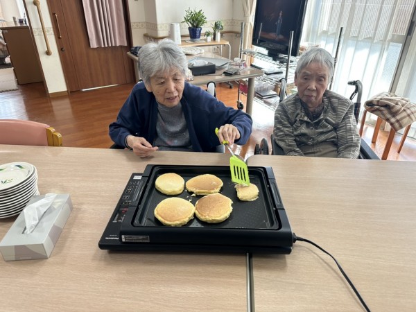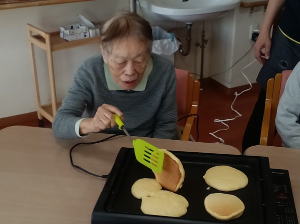 先日1階・2階合同でおやつレクを行いました。今回はホットケーキ&たい焼きです!(^^)!