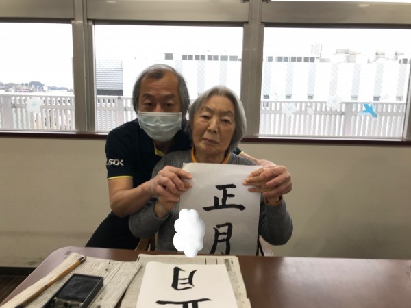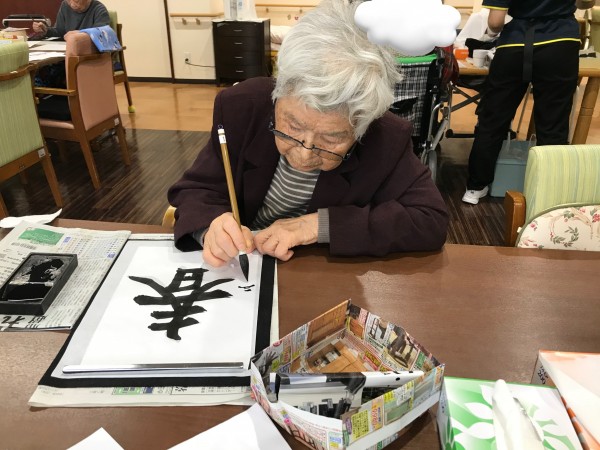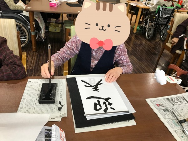半紙に向かって思いをつづって書初めしましたヾ(•ω•`)o