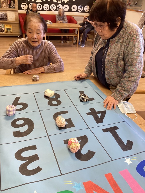 1人6個ずつお手玉を持ち、数字目掛けて投げビンゴを狙います。