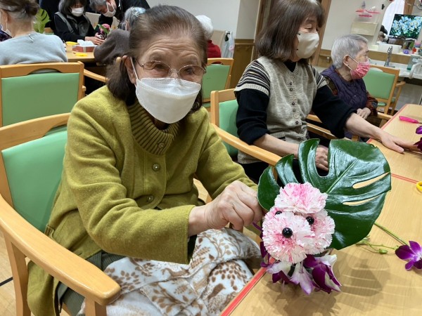 4本のカーネーションには、先生が徹夜で(??)フローラルテープを巻いて下さり、既にワンちゃんのお顔のように見えましたが…
