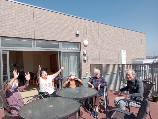 春の暖かな日差しに誘われて4階のテラスで外気浴。
