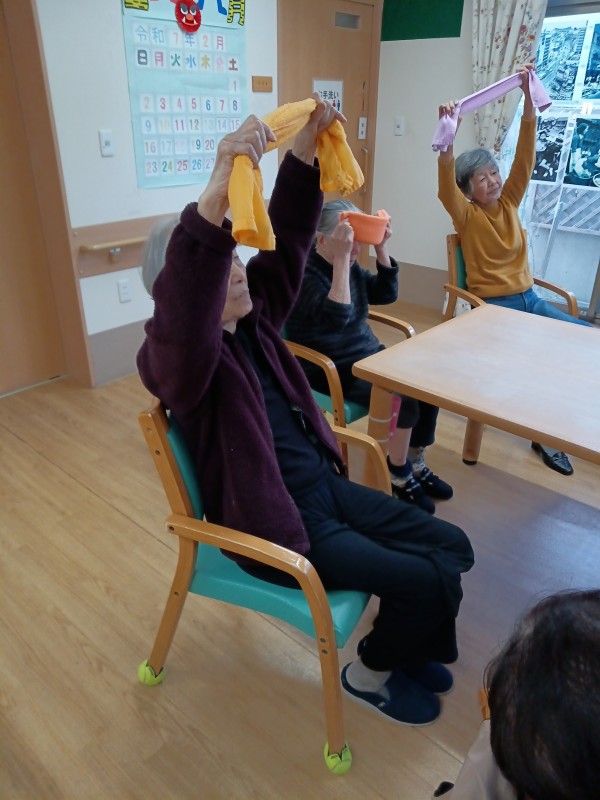 こんにちは、皆さん! 今日のレクはタオル体操で、シンプルながらも心がほっこりする時間を過ごしました。