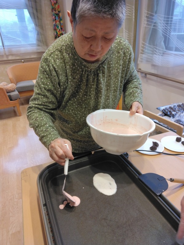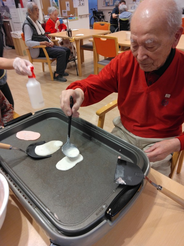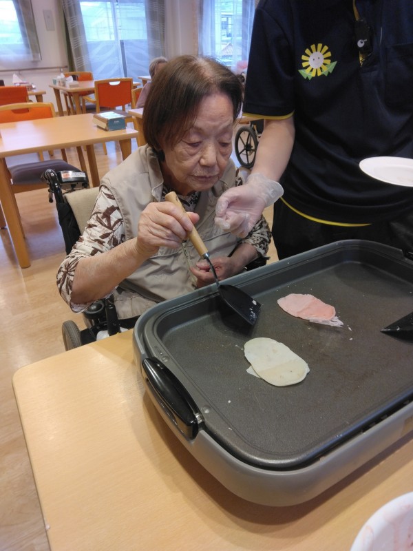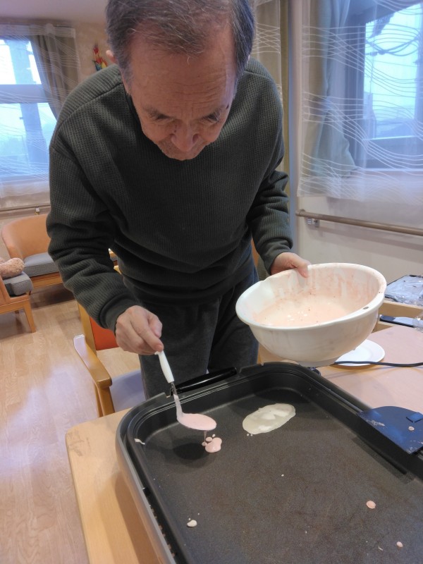 ひな祭りレクの桜もちを焼いている様子です(#^.^#)
