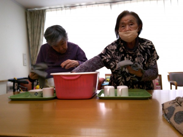 食器拭きやおぼん拭き、テーブル拭きやシーツ交換など、「どんどんやらせて!」「出来なくなっちゃうと困るから」「何十年もやってたんだもん、どうってことないよ~」と、ありがたいお言葉を毎日いただいています。