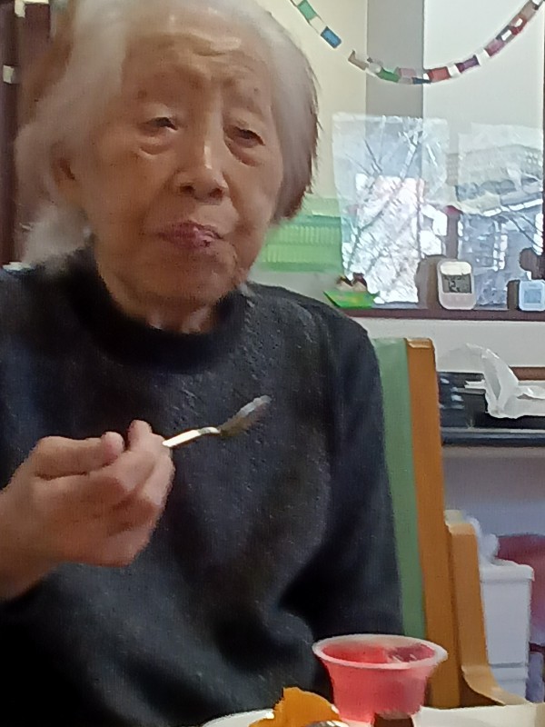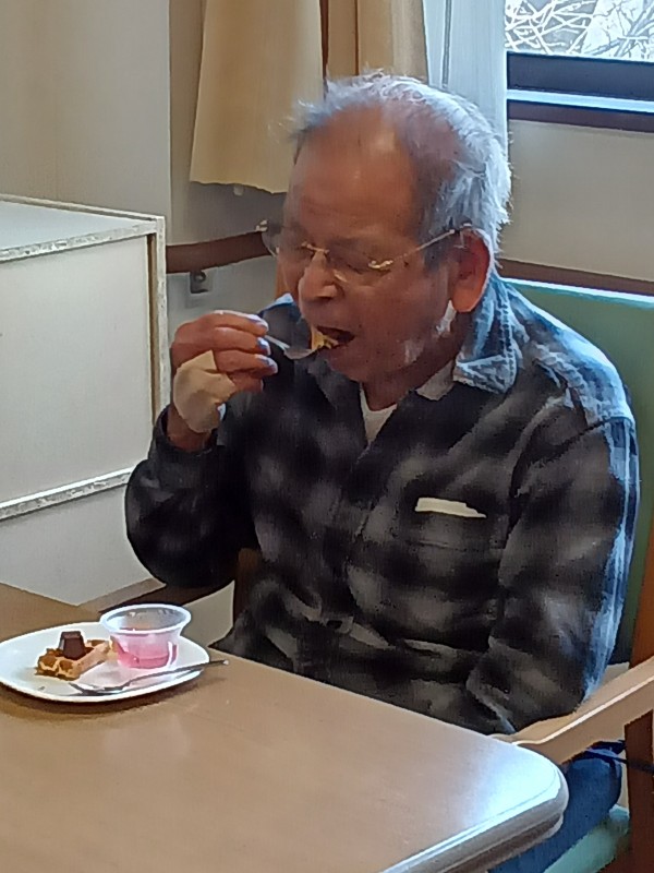 誕生日の歌を入居者様・スタッフで歌い、メッセージも添えてプレゼント贈呈もありましたが、やはりスイ-ツを召し上がっている時のお顔が