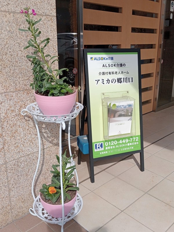 アミカの郷川口のエントランスと花壇に植えたお花たちも