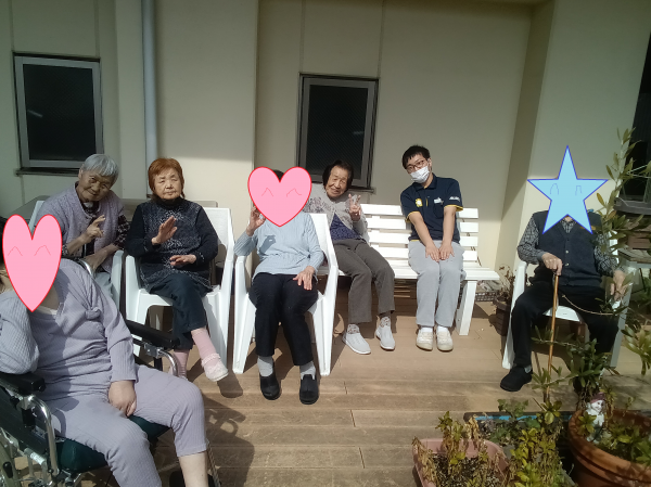 晴れてて良い天気なので皆さんでテラスに出て暖かい太陽にあたりながら記念撮影行いました!!