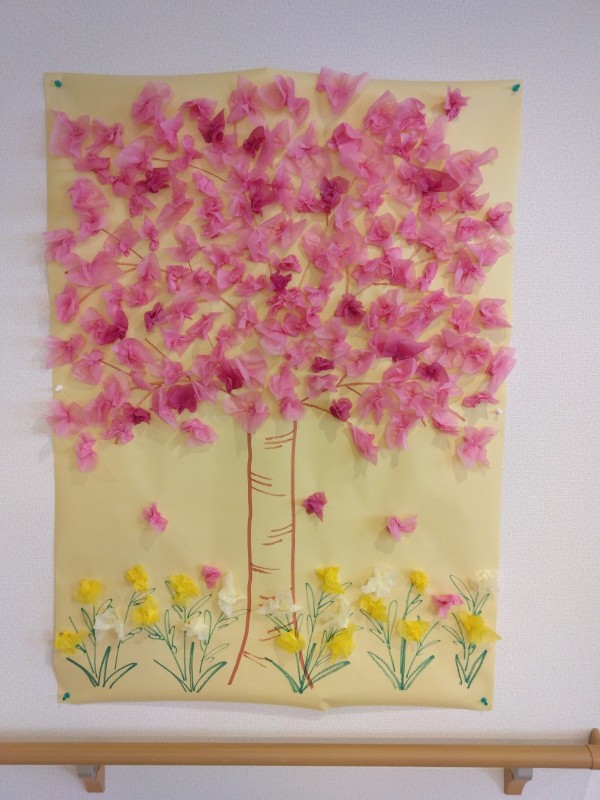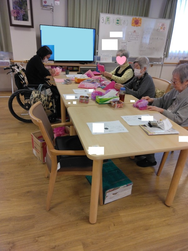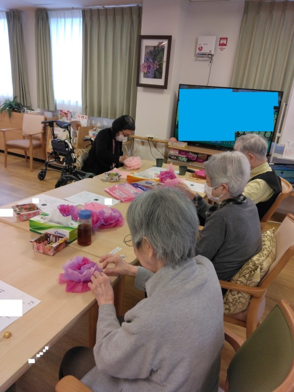 お花を作っています。フロアに展示しているお花は既に満開になっていますが、こちらは18日に来て下さるボランティアさん歓迎のためのお花作りをしています。