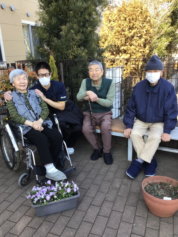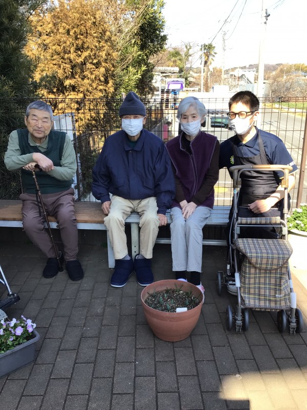 寒い日が続いていますが、晴れて暖かい日はみんなで外でお話したりしています(^^)/
