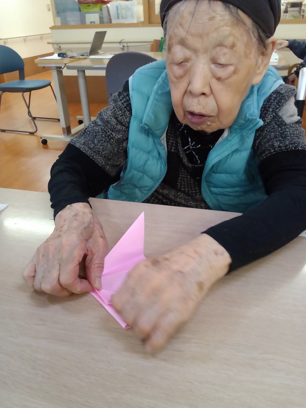 まずは、お好きな色の折り紙を選び「私は青色かしら?」「ピンクが良いです!」「赤がはっきりしているかなぁ?」と悩みながら色を選び