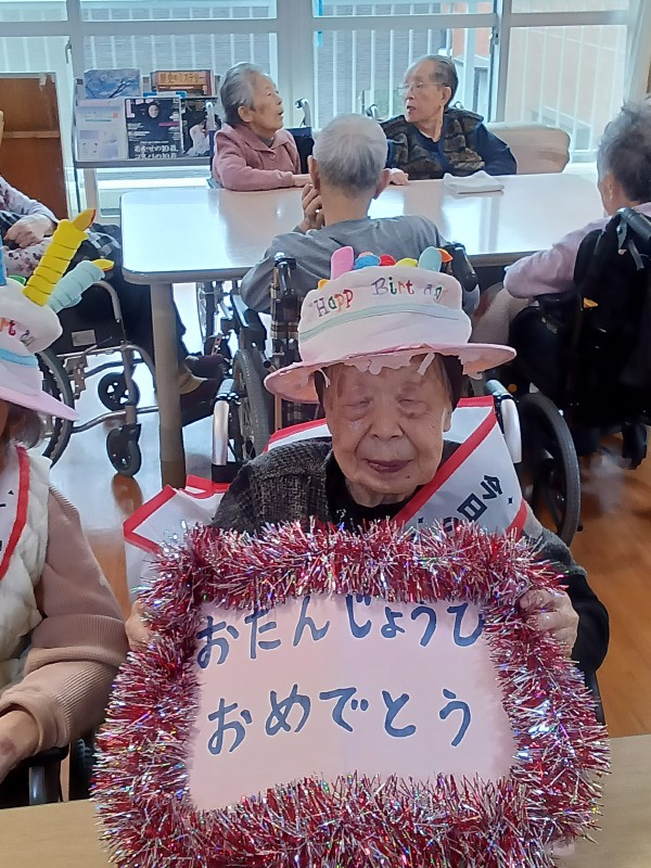 皆さんから「ハッピーバースデー」の歌を唄ってお祝いされ職員からはカードと手作りケーキを♡