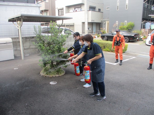 そのあとは蕨市の消防士さんの指導のもと、職員が水消火器を使って練習をしました!