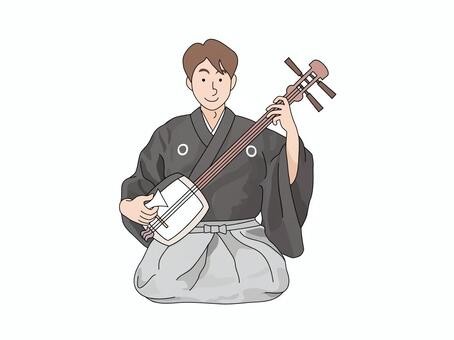 胴を貫通して伸びる棹に張られた弦を、通常、イチョウ形の撥(ばち)で弾き演奏する。