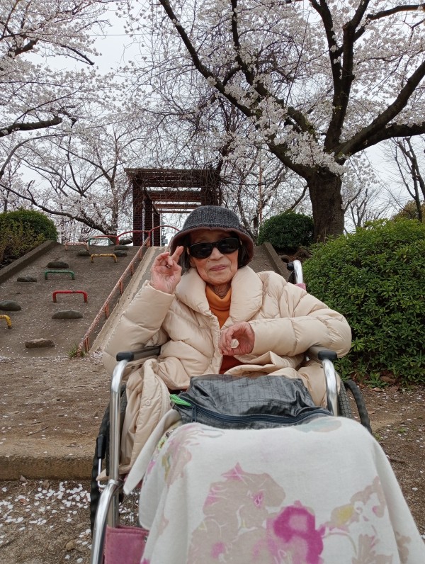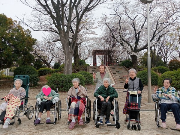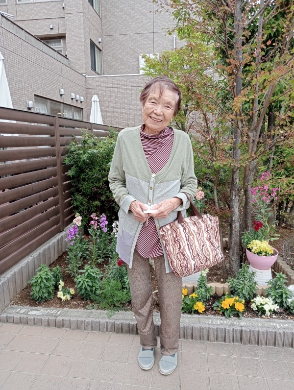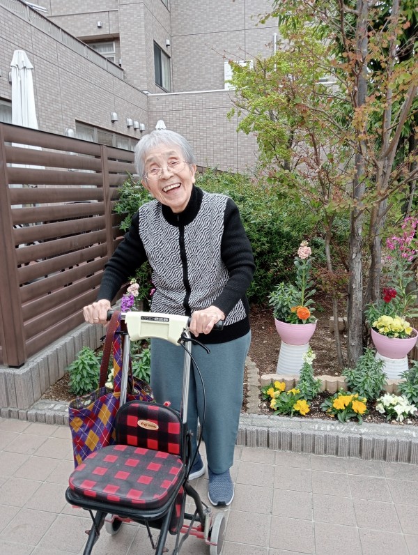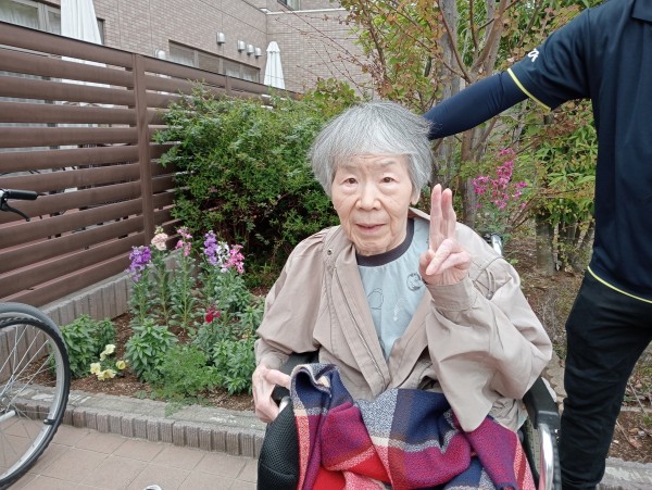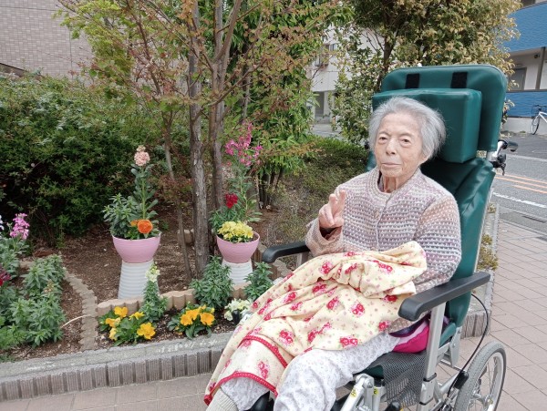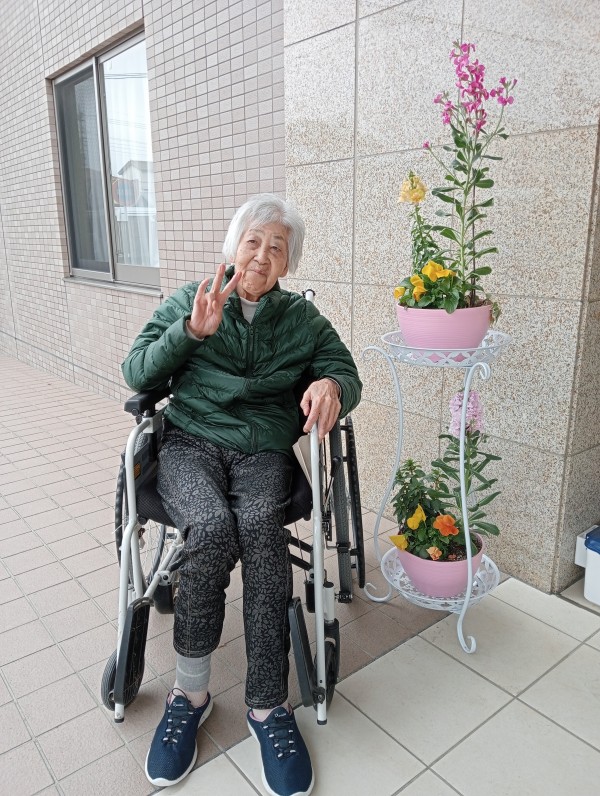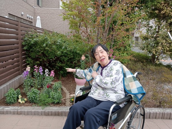 施設の入り口に咲いているお花に見とれる みなさま♡