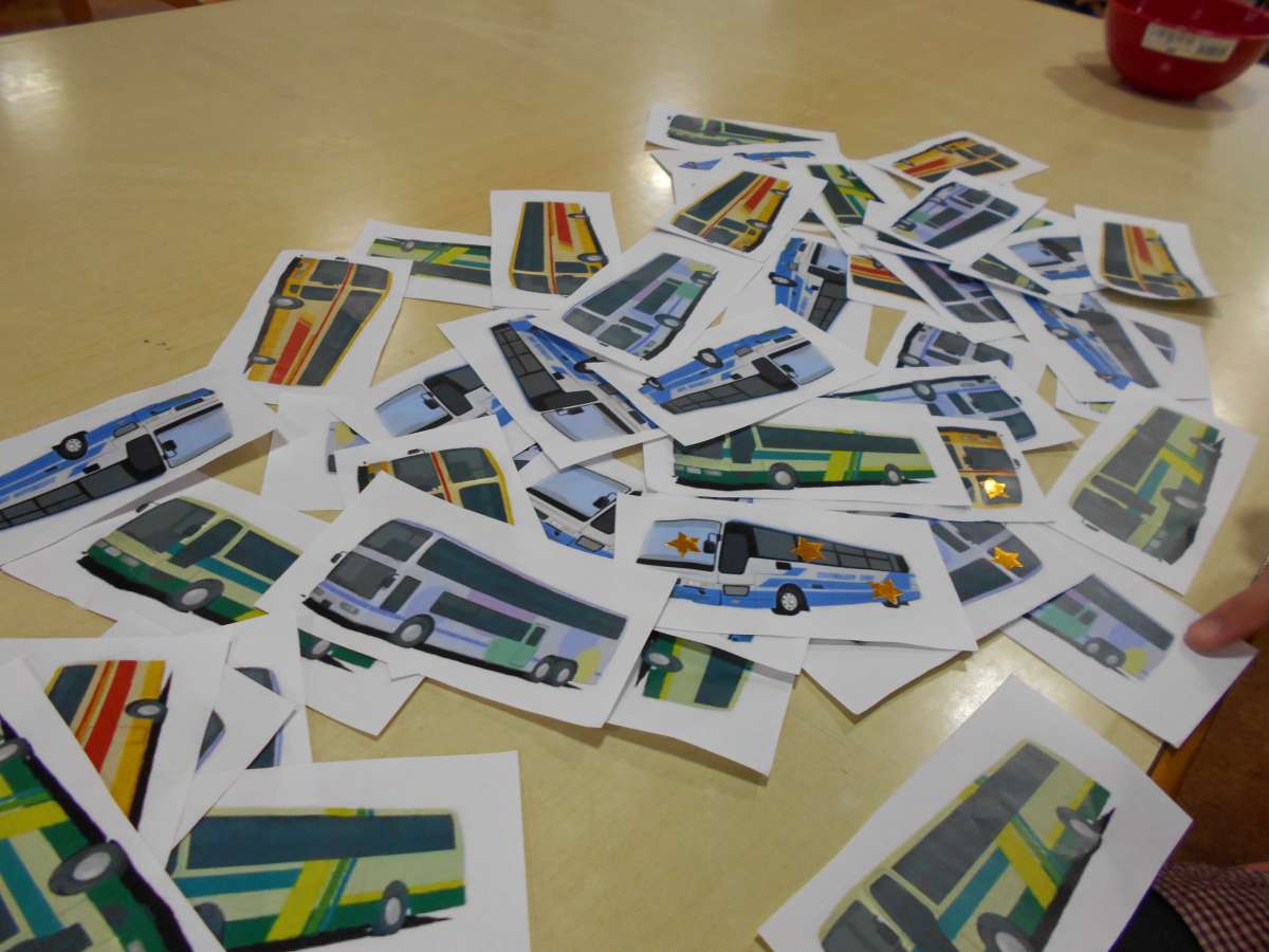 カラフルなバスの絵が描かれたカードをひたすら集めていただきます。