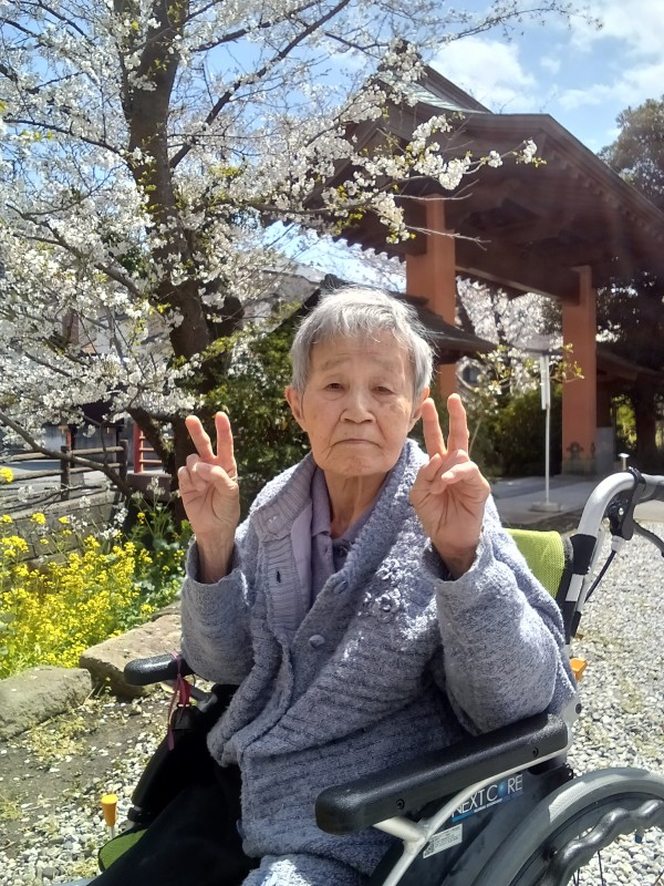 先日、ホームの前に咲いている桜の前で記念撮影をさせていただきました