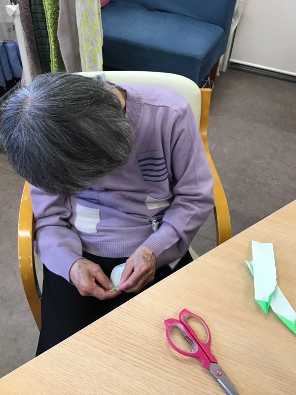 そんな初夏の陽気ですが暦の上ではまだ春なので、皆さんと5月にちなんだ菖蒲の花作りを行いました。
