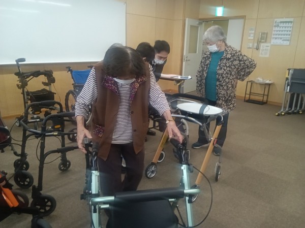 初めに辻所長から介護保険に関して軽く説明後、かたくりさんによる福祉用具の説明がありました。福祉用具と聞くと、杖や歩行器を思い浮かべる方が多いと思いますが、家の中や玄関などに取り付ける手すりやスロープ等も福祉用具・介護保険を使用した住宅改修にあたります。今回はパワーポイントを使用し可視的にも分かりやすく説明いただきました。もちろん杖や歩行器・車椅子等の沢山お持ち頂いたので、休憩時間には実際体験されていた参加者の方もいらっしゃいました。また、ご自身で今現在使用している杖の高さが自分に合っているのかどうかを、福祉業者さんに見てもらい調整して頂いたと喜んでいる参加者さんもいらっしゃいました。