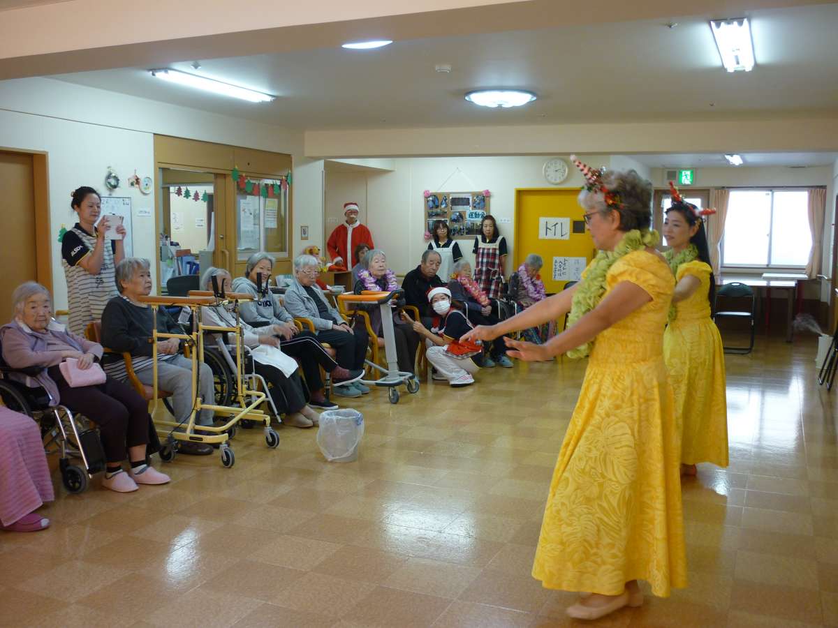 スタッフとボランティヤさんによるフラダンス♪♪♪皆様食い入るように目を丸くして楽しいひと時を過ごされました。