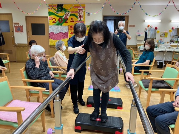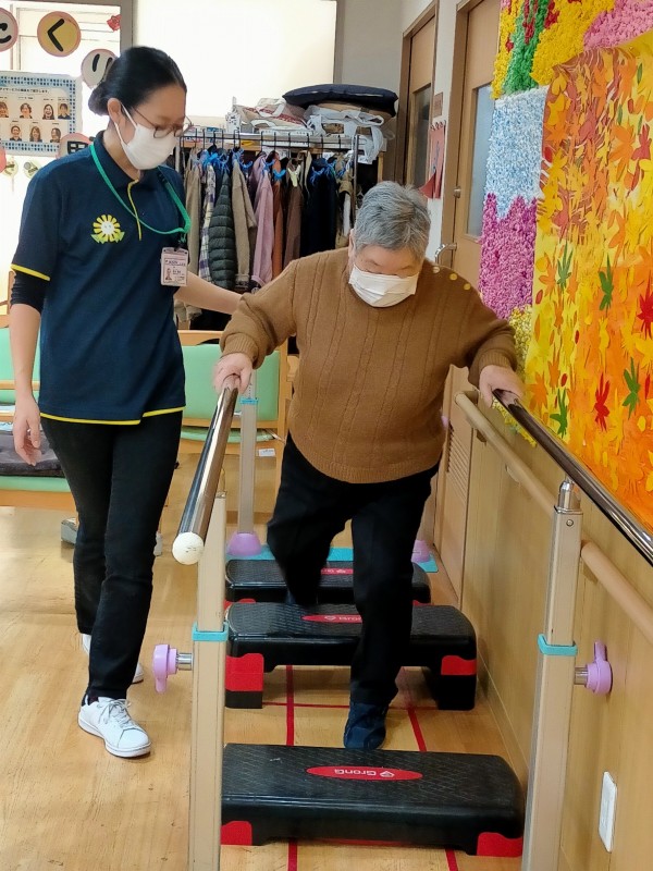 利用者さんの機能に応じて、段差を入れたり、跨ぎ動作を入れたり、はたまた「しりとり」しながらなど、さまざまな使い方をしています。